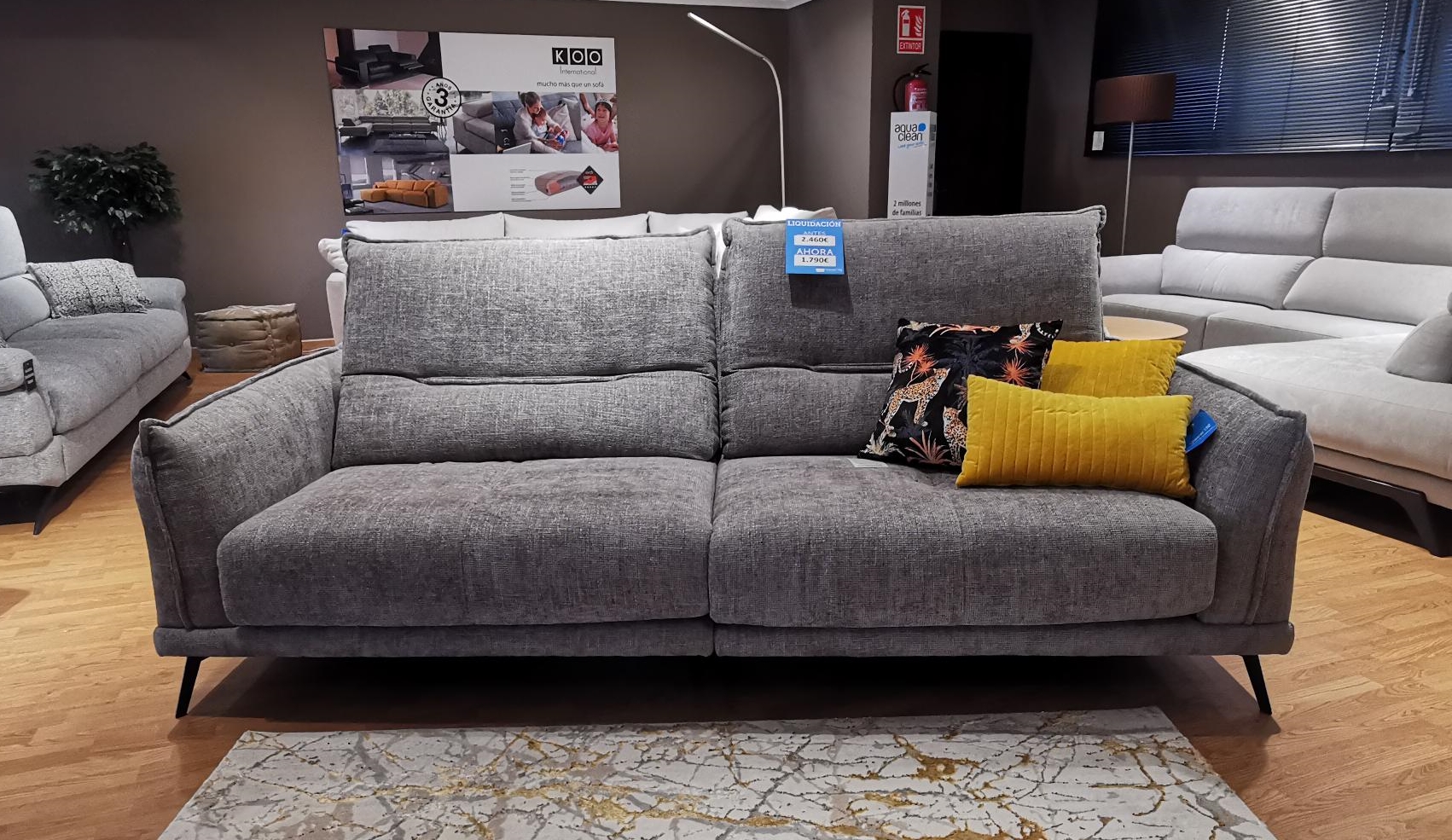 Tapizado: Tejido en color gris oscuro. Tratamiento antimanchas.
